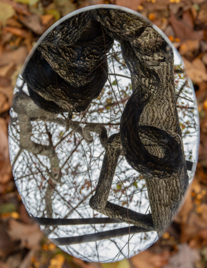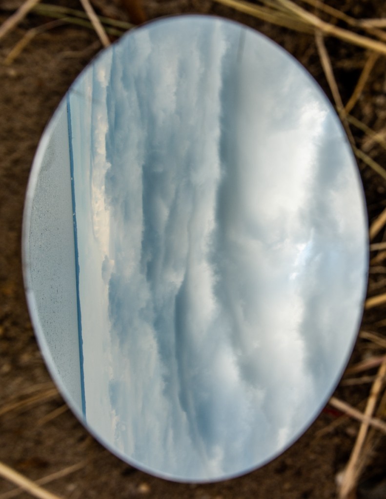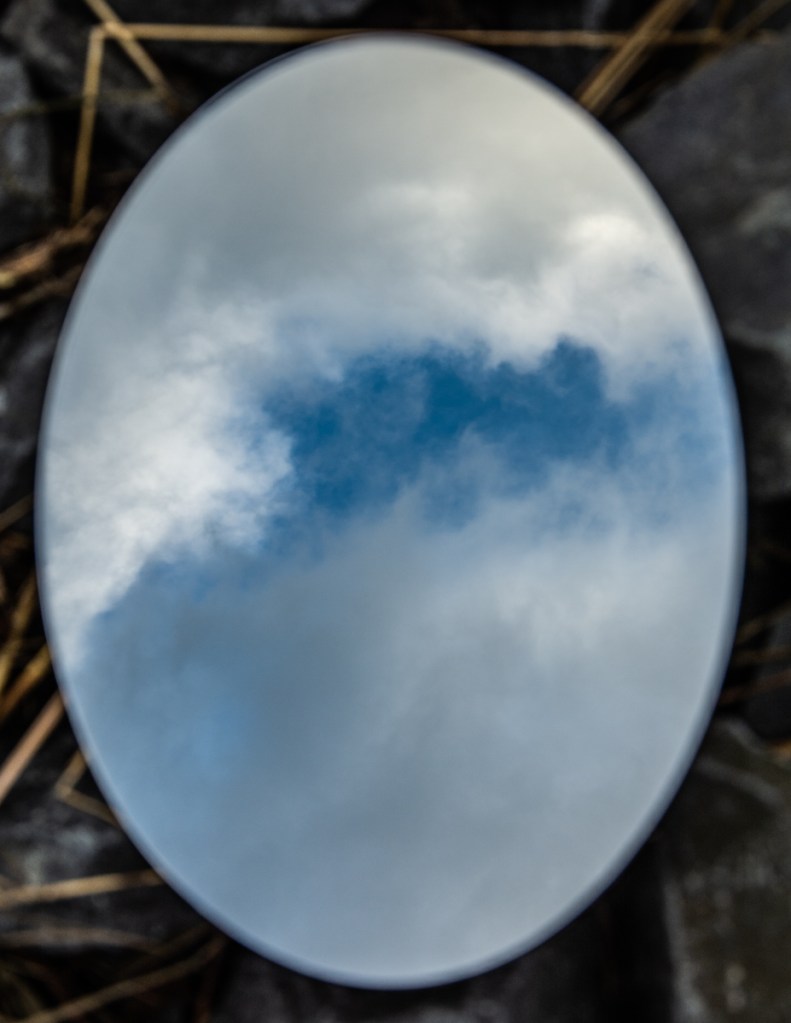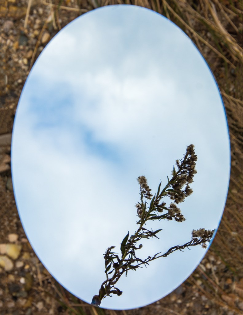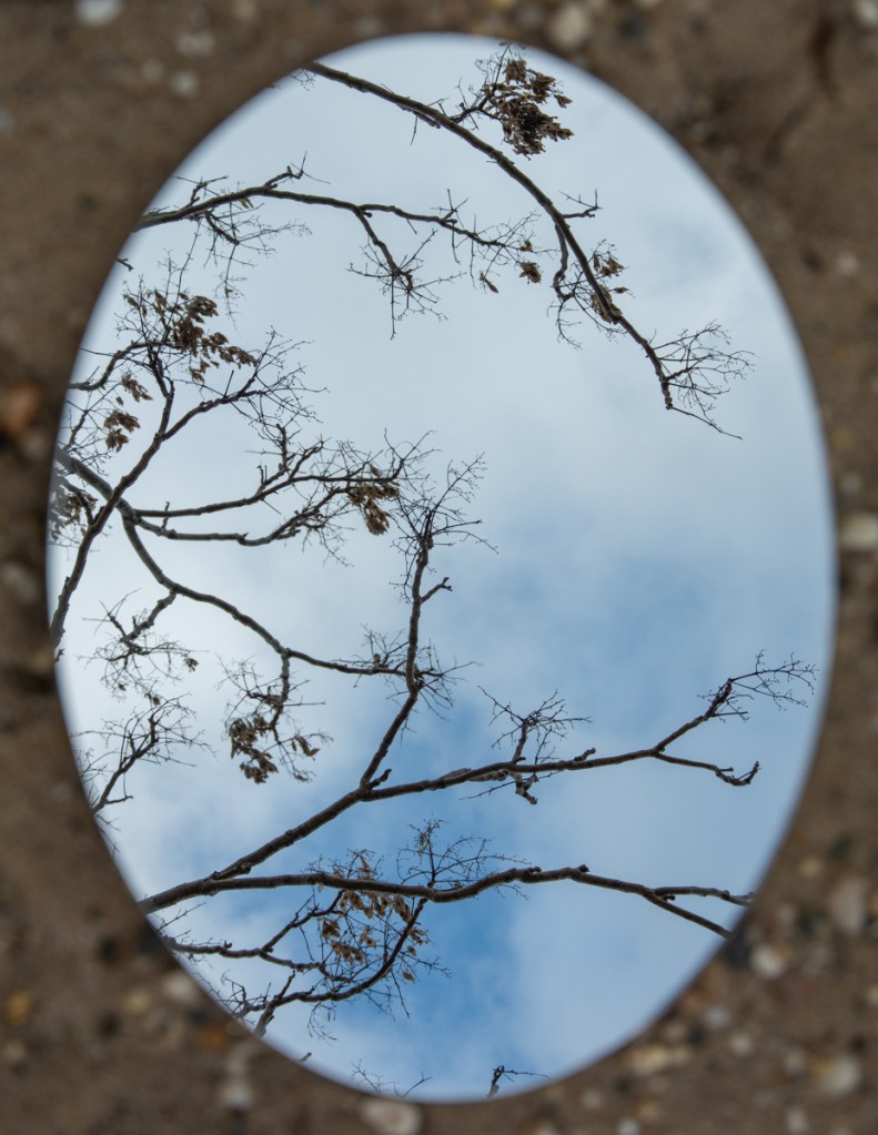 A mirror is placed on the ground in different locations to show a reflection of the sky and the nature directly above it. The mirror seems like a portal since the reflection is out of place from where the background is. Using reflections alters the perspective of the landscapes and can feel disorienting. Using a shallow depth of field I focus on the reflection in the mirror so the ground is out of focus. I take these photographs in locations filled with nature, such as parks and beaches. I tend to find myself looking up at the nature around me and so incorporating a mirror allows me to capture parts of nature that sometimes goes unappreciated.