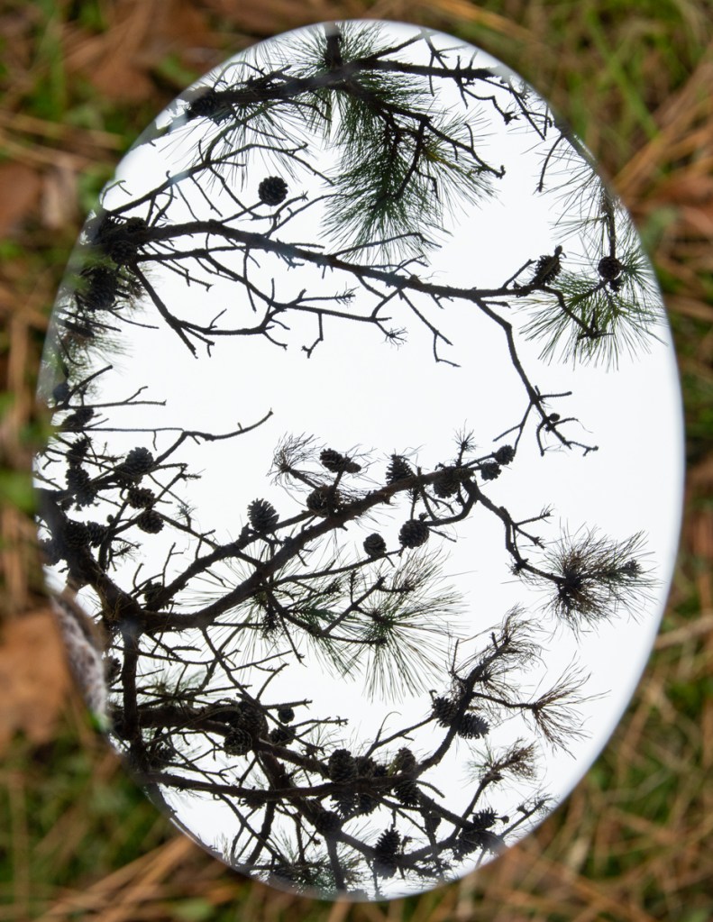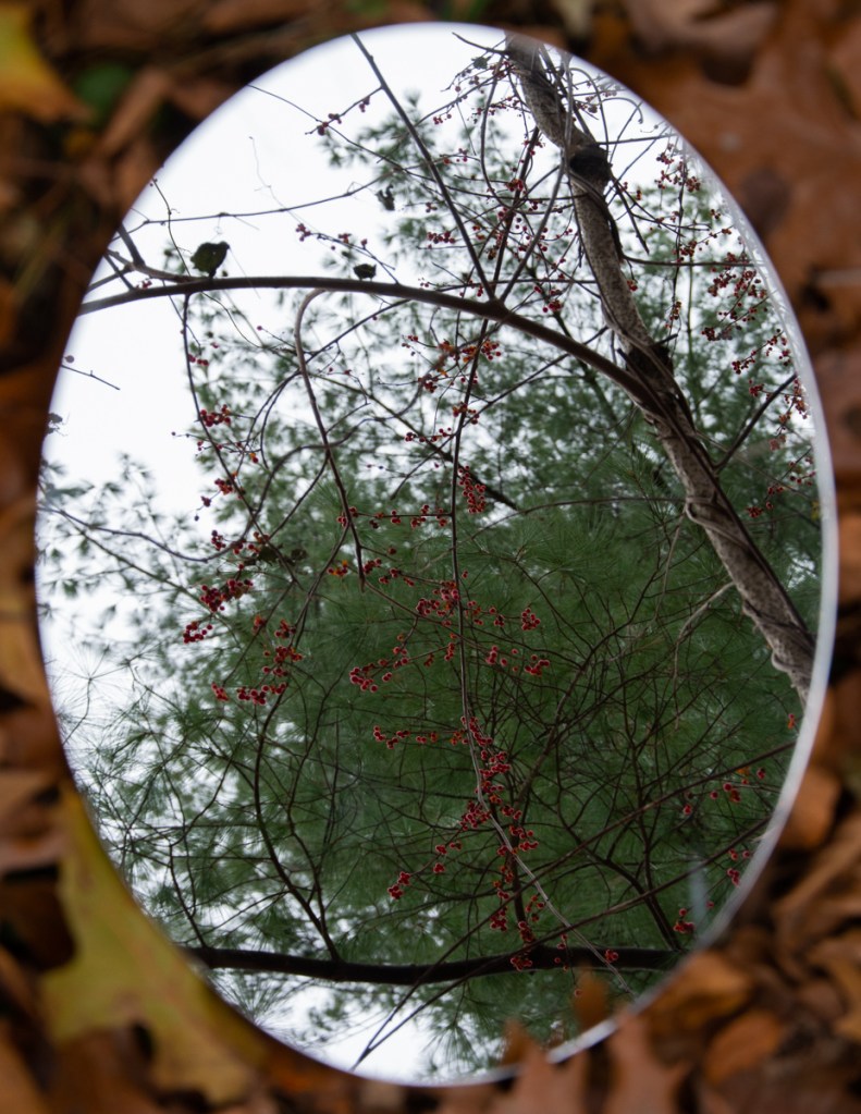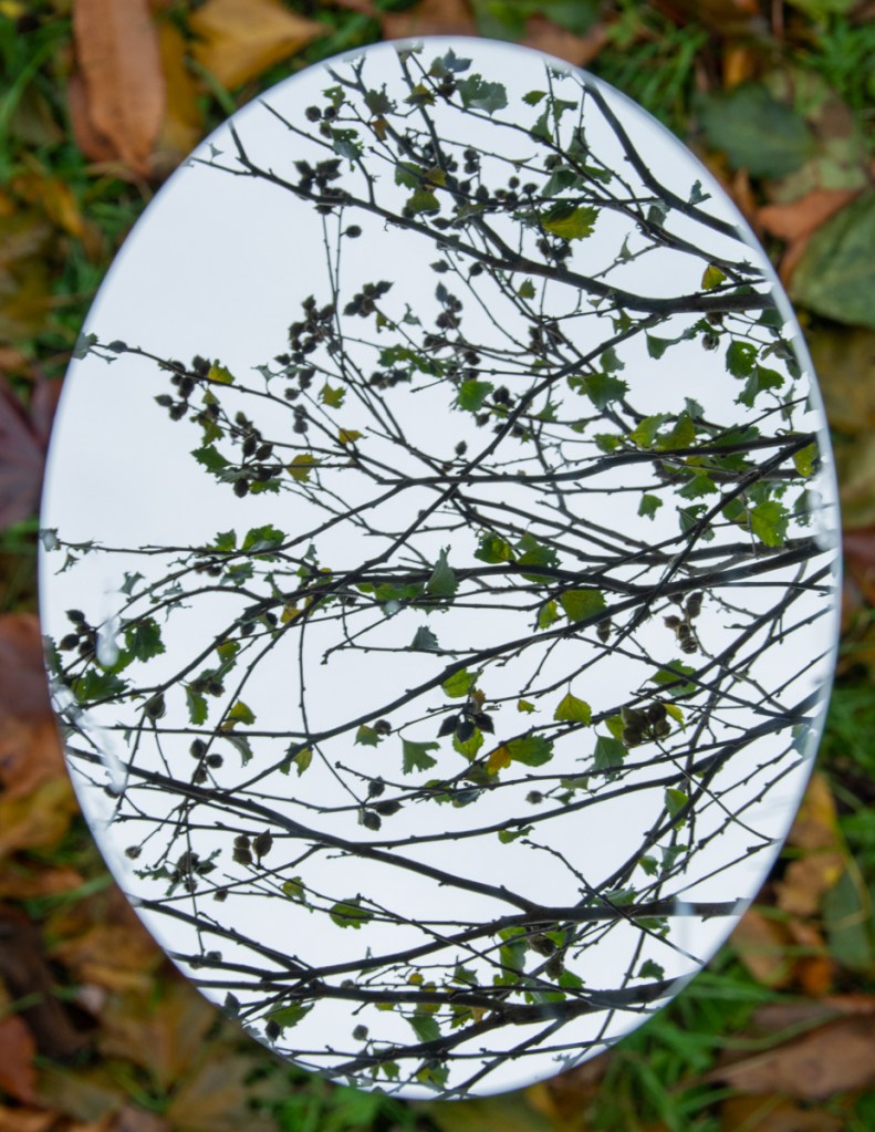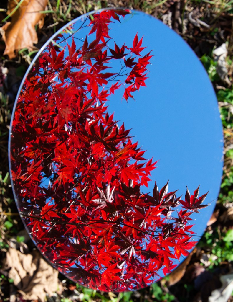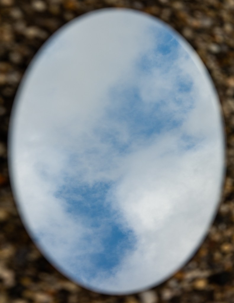 A mirror is placed on the ground in different locations to show a reflection of the sky and the nature directly above it. The mirror seems like a portal since the reflection is out of place from where the background is. Using reflections alters the perspective of the landscapes and can feel disorienting. Using a shallow depth of field I focus on the reflection in the mirror so the ground is out of focus. I take these photographs in locations filled with nature, such as parks and beaches. I tend to find myself looking up at the nature around me and so incorporating a mirror allows me to capture parts of nature that sometimes goes unappreciated.